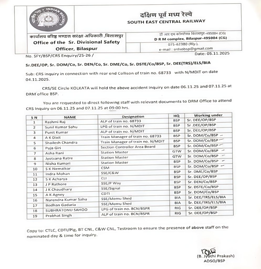 मामले को लेकर रेलवे ने सुरक्षा आयुक्त (CRS) बृजेश कुमार मिश्रा को हादसे की जांच जिम्मेदारी सौंपी है. उन्होंने बुधवार से अपनी जांच शुरू कर दी है. अब 6 और 7 नवंबर को बिलासपुर DRM कार्यालय में पूछताछ होगी, जिसमें रेलवे के करीब 19 कर्मचारी और अधिकारी आवश्यक दस्तावेजों सहित तलब किए गए हैं. इनमें मेमू ट्रेन की सहायक लोको पायलट रश्मि राज, मालगाड़ी के गार्ड सुनील कुमार साहू, सहायक लोको पायलट पुनीत कुमार, मेमू ट्रेन के मैनेजर ए के दीक्षित, मालगाड़ी के मैनेजर शैलेश चंद्र, तीन स्टेशन मास्टर आशा रानी, ज्योत्स्ना रात्रे और निशा कुमारी, सेक्शन कंट्रोलर पूजा गिरी, CLI एस के आचार्य, CSM एस के निर्मलकर, सेक्शन इंजीनियर जे पी राठौर, जे के चौधरी, नरेंद्र साहू, बोधन गड़रिया, और कई अन्य तकनीकी कर्मचारी शामिल है.