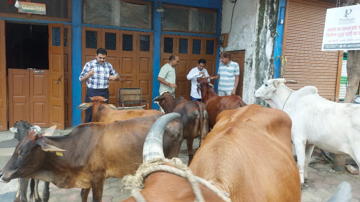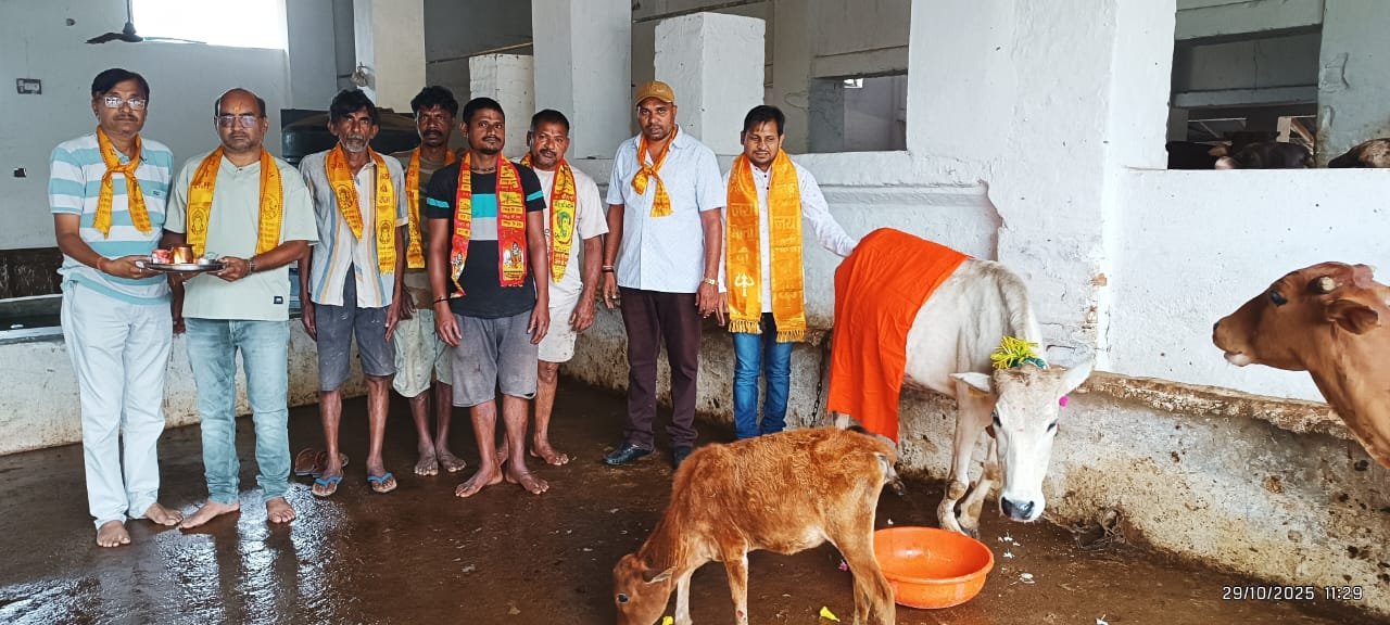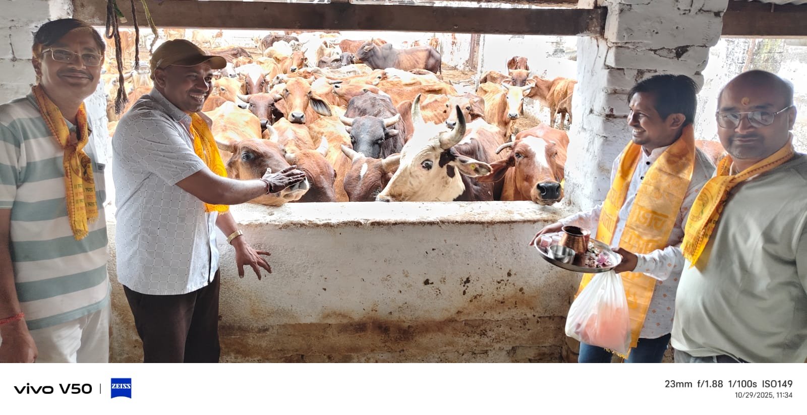 संस्कारधानी राजनांदगांव की सेवा में समर्पित संस्था बाल रत्न मंच सेवा समिति गौ सेवा रथ दो रोटी के सेवाभावी समर्पित गौ सेवकों द्वारा शहर के विभिन्न सड़के गलियां , हमाल पारा, रामाधीन मार्ग , गंज लाइन भारत माता चौक , सदर लाल नंदई चौक , इंदिरा नगर दुर्गा चौक , बसंतपुर हॉस्पिटल के पास, चौक चौराहा में सर्व देवमई गौ माता का विधि विधान से पूजन अर्चन करते हुए चरणों में जल अर्पण, तिलक पुष्प एवं मौली धागा व वस्त्र समर्पित कर, आरती पूजन करते हुए गौ माता को गुड और रोटी खिलाकर गौ प्रदक्षिणा करते हुए गौ माता से संपूर्ण विश्व के मंगल कामना का आशीर्वाद मांगा साथ ही संस्कारधानी की स्वास्तिक जन समर्पण सेवा समिति को घायल गौ माता के उपचार सेवा के लिए बाल रत्न मंच सेवा समिति परिवार की ओर से 2100 रुपए संस्था परिवार की ओर से सहयोग किया गया ,गौ भक्त मयंक शर्मा ने आगे बताया कि गौ माता धरती की सबसे बड़ी वेधराज है गौ माता के दूध में अमृत, गोमूत्र में कष्ट निवारक दवा है गाय की गर्दन को सहलाने से असाध्याय से असाध्य रोगों का नाश होता है। भारतीय सनातन संस्कृति में गौ सेवा सबसे उत्तम सेवा मानी गई है गौ सेवा से जन्म जन्मअंतर के पापों का नाश होता है गौ सेवा बड़े भाग्य से मिलती है जहां पर गौ माता का वास होता है देवलोक कहलाता है।