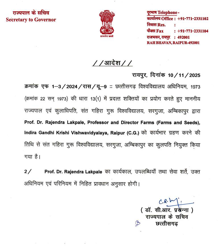 छत्तीसगढ़ विश्वविद्यालय अधिनियम, 1973 की धारा 13 (1) में प्रदत्त शक्तियों का प्रयोग करते हुए राज्यपाल एवं कुलाधिपति डॉ. डेका ने नियुक्ति की है. डॉ. राजेंद्र लकपाले का कार्यकाल, उपलब्धियाँ तथा सेवा शर्ते, उक्त अधिनियम एवं परिनियम में निहित प्रावधान अनुसार होगी.