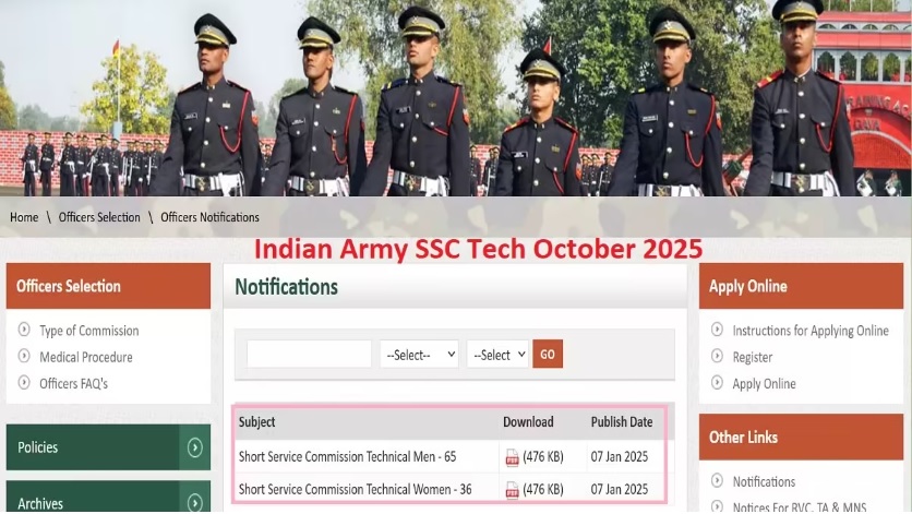 जॉब डेस्क। इंजीनियरिंग डिग्री प्राप्त कर चुके या इंजीनियरिंग के अंतिम वर्ष में अध्ययनरत ऐसे अभ्यर्थी जो इंडियन आर्मी में शामिल होकर देश की सेवा करना चाहते हैं उनके पास बेहतरीन मौका है। इंडियन आर्मी शॉर्ट सर्विस कमीशन (SSC) Tech (65TH SSC (TECH) MEN & 36th SSC (TECH) WOMEN (October 2025) भर्ती के लिए आवेदन पत्र भरने की लास्ट डेट 5 फरवरी 2025 निर्धारित है। ऐसे में इच्छुक एवं योग्य अभ्यर्थी तय तिथियों के अंदर ऑनलाइन माध्यम से भारतीय सेना की ऑफिशियल वेबसाइट joinindianarmy.nic.in पर जाकर आवेदन पत्र भर सकते हैं। अन्य किसी भी प्रकार से फॉर्म स्वीकार नहीं किया जायेगा।कुल 381 रिक्त पदों को भरने के लिए हो रही भर्ती