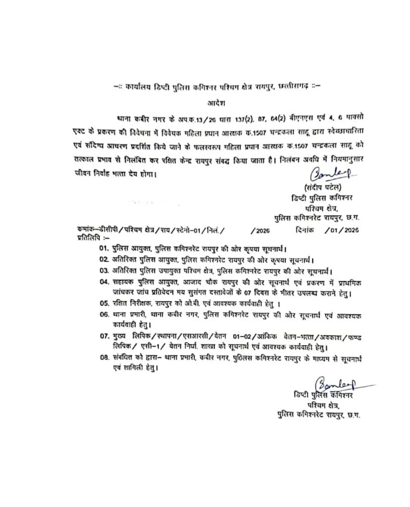 डीसीपी वेस्ट संदीप पटेल द्वारा जारी निलंबन आदेश में उल्लेख किया गया है कि धारा 137(2), 67, 64(2) बीएनएस एवं 4, 6 पॉक्सो एक्ट के तहत दर्ज प्रकरण की विवेचना के दौरान प्रधान आरक्षक क्रमांक 1507 चंद्रकला साहू द्वारा स्वेच्छाधारिता और संदिग्ध आचरण प्रदर्शित किया गया.