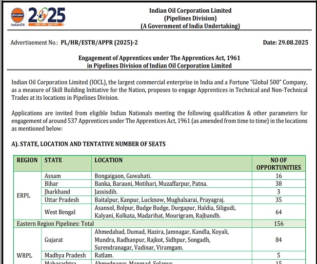 जॉब डेस्क। इंडियन ऑयल कॉर्पोरेशन लिमिटेड (IOCL) की ओर से पाइपलाइन डिवीजन में अप्रेंटिस के रिक्त पदों पर भर्ती निकाली गई है। जो भी अभ्यर्थी सरकारी जॉब पाने का मौका ढून्ढ रहे हैं वे इस भर्ती में शामिल होने के लिए निर्धारित अंतिम तिथि 18 सितंबर 2025 तक फॉर्म भर सकते हैं। ध्यान रखें कि एप्लीकेशन फॉर्म केवल ऑनलाइन माध्यम से ही भरा जा सकता है, अन्य किसी भी प्रकार से फॉर्म स्वीकार नहीं किये जायेंगे।