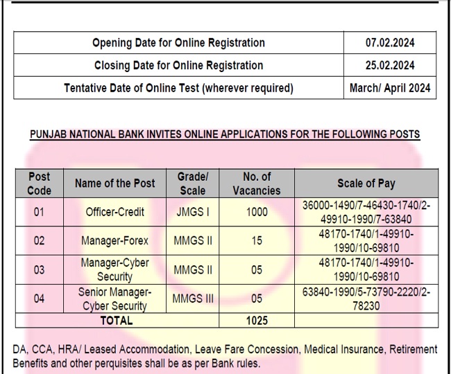 जॉब डेस्क। पंजाब नेशनल बैंक में सरकारी नौकरी के इच्छुक उम्मीदवारों के लिए काम की खबर। पंजाब नेशनल बैंक द्वारा एक हजार से अधिक स्पेशलिस्ट ऑफिसर की भर्ती के लिए अधिसूचना (PNB SO Notification 2024) जारी की गई है। बैंक द्वारा अधिसूचना के अनुसार ऑफिसर – क्रेडिट, मैनेजर – फॉरेक्स, मैनेजर – साइबर सिक्यूरिटी और सीनियर मैनेजर – साइबर सिक्यूरिटी के कुल 1025 पदों पर भर्ती की जानी है। इनमें सबसे अधिक 1000 वेकेंसी ऑफिसर-क्रेडिट की है।