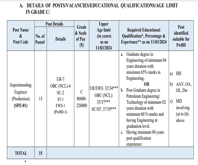 अधीक्षक अभियंता पदों पर आवेदन करने के लिए उम्मीदवारों ने चार वर्षीय इंजीनियरिंग डिग्री न्यूनतम 65 प्रतिशत अंकों के साथ प्राप्त की हो या दो वर्षीय पोस्ट ग्रेजुएशन डिग्री पेट्रोलियम इंजीनियरिंग/ टेक्नोलॉजी में 60 प्रतिशत अंकों के साथ प्राप्त की हो। इसके साथ ही अभ्यर्थी के पद पोस्ट क्वालिफिकेशन के बाद 4 वर्ष का अनुभव होना चाहिए। अभ्यर्थी की अधितम आयु अनरिजर्व/ ईडब्ल्यूएस के लिए 32/ 34, ओबीसी के लिए 35/ 37 और एससी/ एसटी के लिए 37/ 39 वर्ष तय की गयी है।