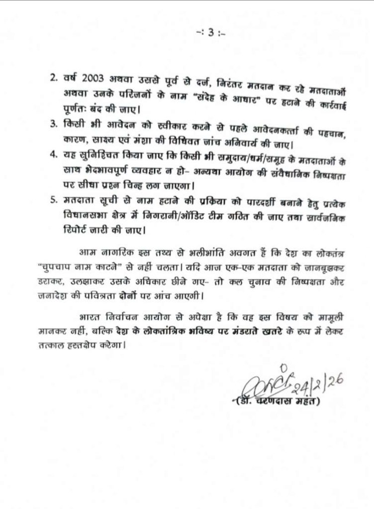 नेता प्रतिपक्ष डॉ चरण दास महंत ने निर्वाचन आयोग को लिखे पत्र में कहा कि छत्तीसगढ़ में वर्ष 2025 में मतदाता सूची की शुद्धता हेतु विषेश गहन पुनरीक्षण SIR की प्रक्रिया प्रारंभ की गई थी. लोकतंत्र के हित में यह कदम स्वागत योग्य हो सकता था – यदि इसके बाद मताधिकार पर सुनियोजित हमला न किया जाता. लेकिन आज स्थिति यह बन चुकी है SIR पूर्ण होने के बावजूद हर विधानसभा क्षेत्र में वर्ग विशेष के हजारों नागरिकों को मतदाता सूची से बाहर कर दिए जाने का भय सता रहा है, जबकि वे वर्षों से लगातार चुनावों में मतदान करते रहे हैं.