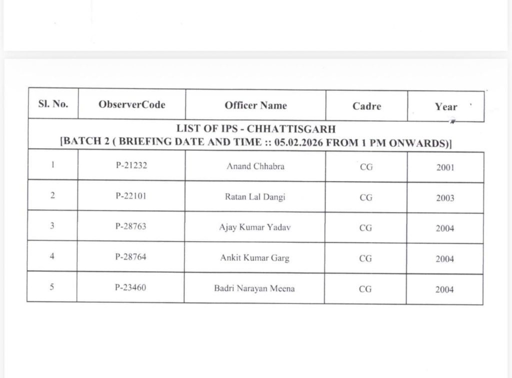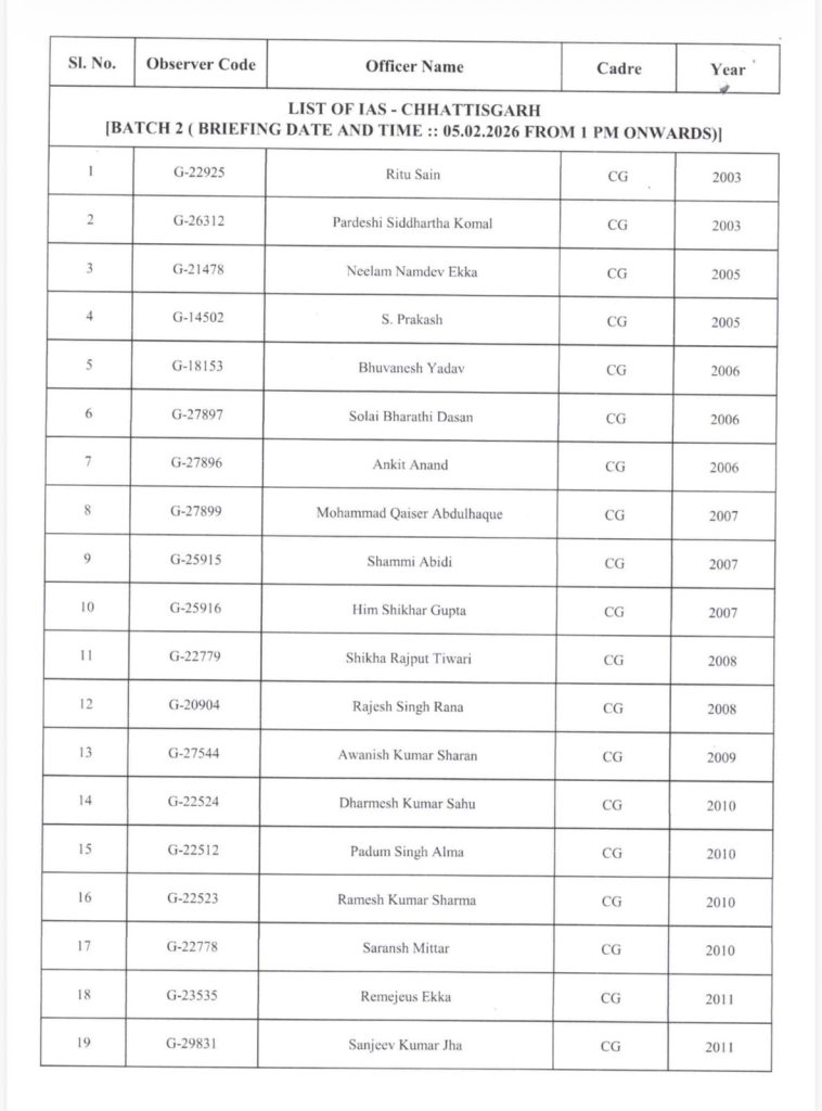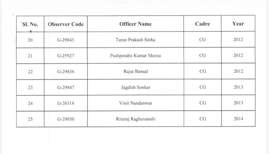 जिन पच्चीस अधिकारियों को ऑब्जर्वर बनाया गया है, उनमें IAS रितु सेन, सिद्धार्थ कोमल परदेसी, नीलम नामदेव एक्का, एस प्रकाश, भुवनेश यादव, एस भारती दासन, अंकित आनंद, मो. कैसर अब्दुल हक, समी आबिदी, हिमशिखर गुप्ता, शिखा राजपूत तिवारी, राजेश सिंह राणा, अवनीश कुमार शरण, धर्मेश कुमार साहू, पदुम सिंह एल्मा, रमेश कुमार शर्मा, सारांश मित्तर, रिमी जुएस एक्का, संजू कुमार झा, तारण प्रकाश सिन्हा, पुष्पेंद्र कुमार मिणा, रजत बंसल, जगदीश सोनकर, विनीत नंदनवार और रितुराज रघुवंशी शामिल हैं.