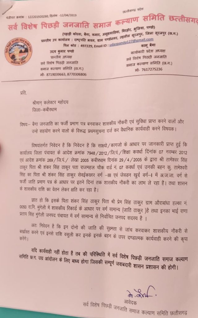 कवर्धा। कवर्धा में सामान्य वर्ग के दो शिक्षकों द्वारा अनुसूचित जनजाति का फर्जी प्रमाण पत्र बनाकर सरकारी नौकरी हासिल करने का मामला सामने आने के बाद आदिवासी समाज में आक्रोश फैल गया है। इस अन्याय के खिलाफ आवाज उठाते हुए आदिवासी समाज के लोगों ने आज सामाजिक पदाधिकारियों के साथ कलेक्ट्रेट पहुंचकर कलेक्टर को ज्ञापन सौंपा और दोषी शिक्षकों पर सख्त कार्रवाई की मांग की।