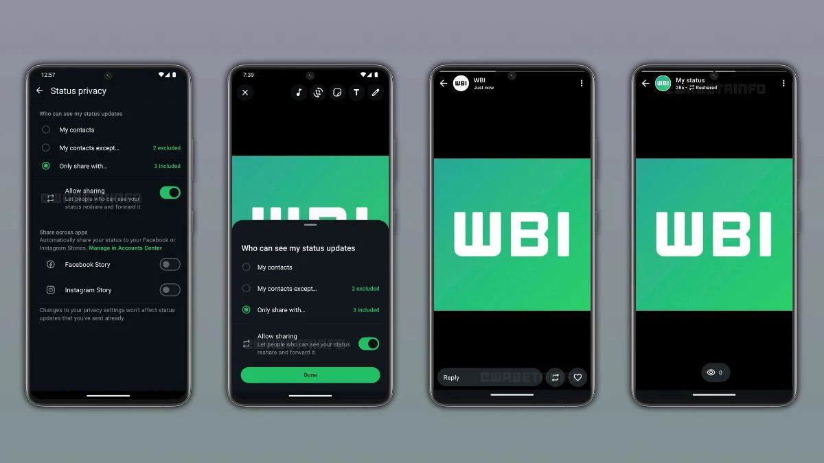 WABetaInfo की रिपोर्ट के मुताबिक, स्टेटस रिशेयरिंग कंट्रोल वाले अपकमिंग फीचर को WhatsApp Beta ऐप Android वर्जन 2.25.27.5 में स्पॉट किया गया है। मेटा का वॉट्सऐप को मिलने वाला यह अपडेट यूजर्स की प्राइवेसी को बेहतर करता है। यह यूजर को शेयर किए गए स्टेटस पर और ज्यादा कंट्रोल देने के लिए डिजाइन किया गया है।